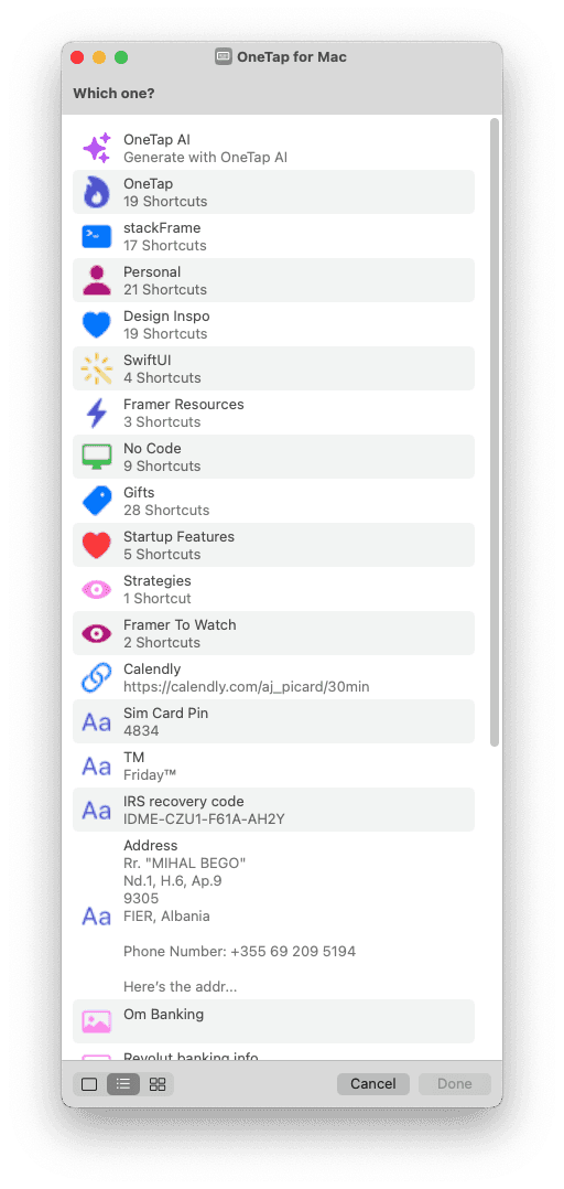 On Mac you don’t have access to a digital keyboard so what we integrated a Siri Shortcut which displays all the shortcuts you’ve created in OneTap and acts as a replacement for the digital keyboard.